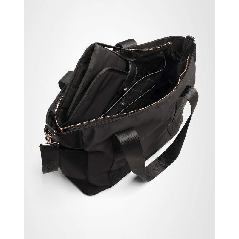 The bag is high on detail as well as function, with luxe metal hardware and Madison monogram webbing. Its multiple exterior pockets have the perfect location for your phone, baby bottle, and keys, ensuring you can quickly access any item. And, when the time comes, it will be a loved bag to use without the change mat as a great overnight or gym bag.