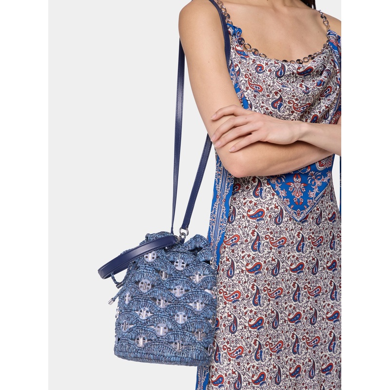 - Handle and removable blue leather shoulder strap allowing for shoulder or crossbody wear. Details of iconic 1969 silver metallic discs.