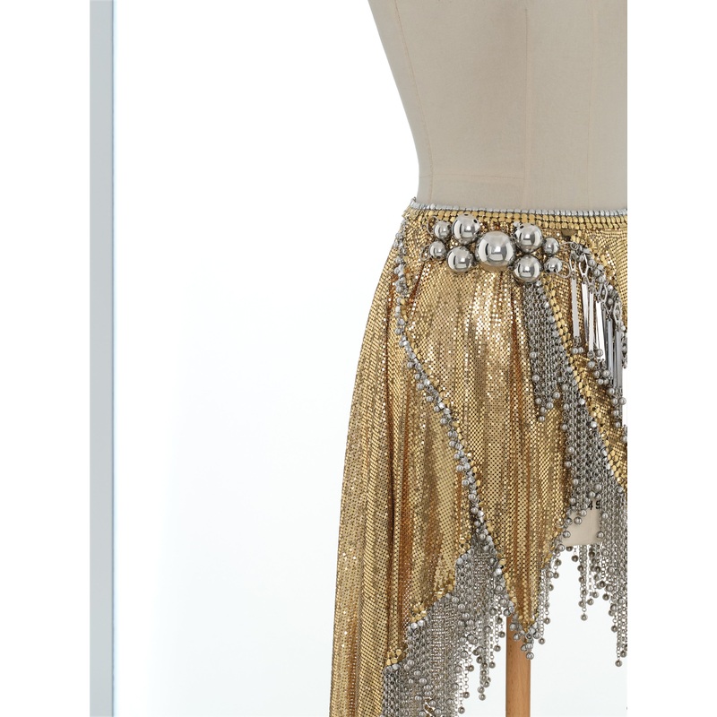 Draped wrap skirt made in iconic mesh with metallic embellishment details.