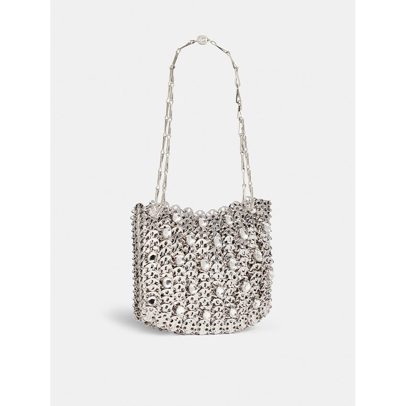 Relaunch of the Iconic 1969 bag with rhinestones. This radiant silverbag adorned with glass rhinestones is a true reflection of the identity and expertise of the MaisonRabanne. The pliable silver bag is a unique fabrication of 367 silver discs bonded by metal rings.