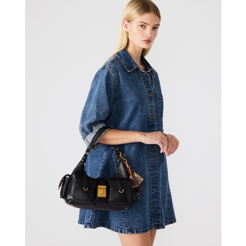 The ISSAC BAG BLACK is a versatile cargo shoulder bag designed for organized, everyday use. Featuring multiple functional pockets, a magnetic snap tab, and secure zipper closures, it offers practical storage solutions. Inside, standard organization compartments keep essentials neatly arranged, while a back zipper adds easy access. The bag is accented with a distinctive tassel horse-bit chain, combining style with utility for a refined, expert look.