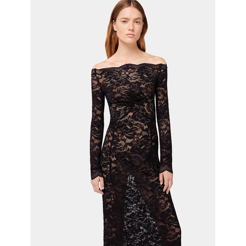 Long black lace dress with bardot collar