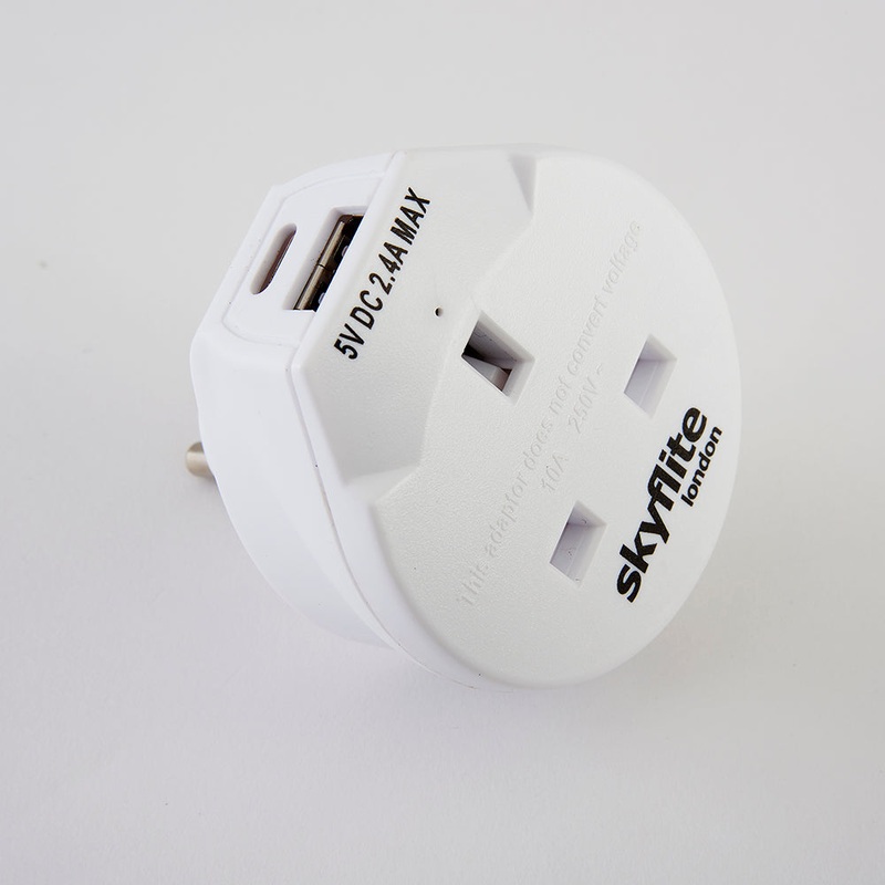 Skyflite Travel Accessories are designed to make every journey safer, easier, and more convenient. This UK to Europe travel adapter lets you plug UK three-pin devices into standard European two-pin sockets, and includes built-in USB-A and USB-C ports so you can charge phones, tablets, and other gadgets without a separate charger. Compact and lightweight, its the ideal all-in-one solution for city breaks and business trips across Europe. Note: Adapter does not convert voltage.