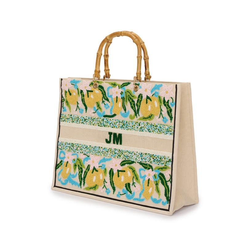 Increase your style with The Almafi Lemon Tote. This hand beaded tote will add a touch of citrus charm to any outfit. Crafted with expertise, it features a unique lemon design that will stand out. Elevate your fashion game and carry all your essentials in this one-of-a-kind tote.