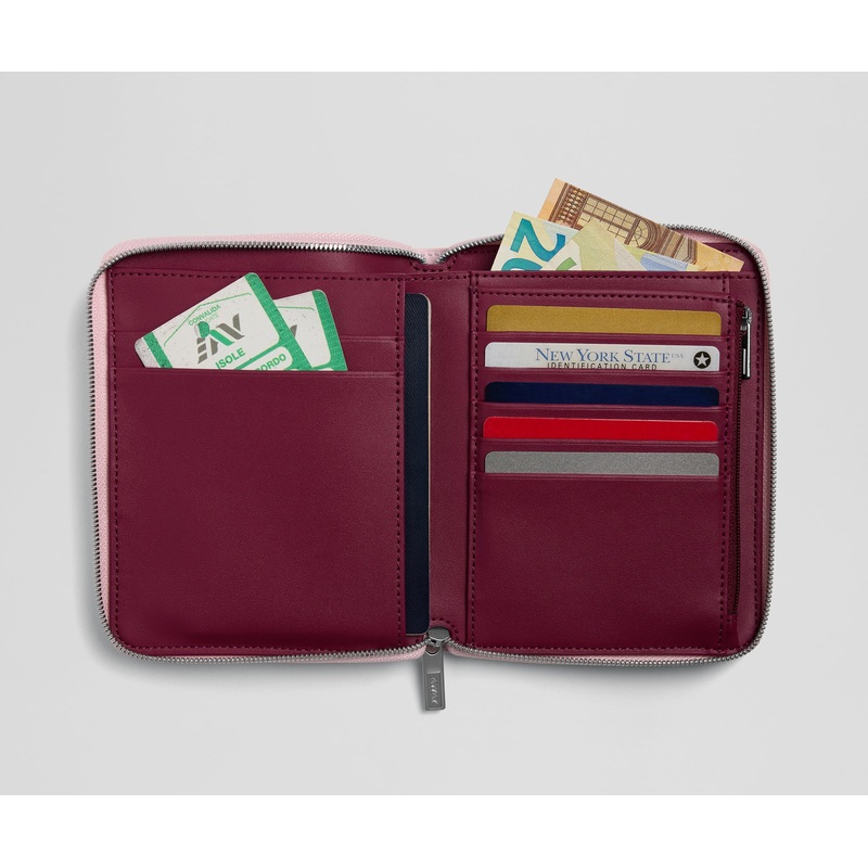Streamline your journeys with our Travel Walletbecause keeping track of passports, credit cards, and cash shouldnt slow you down. Crafted with 51% smooth, recycled leather, this wallet is built to hold up to four passports, five credit cards or IDs, plus a zippered pocket for coins and small essentials. Traveling with a crew? No problemtheres room for everyones passports and boarding passes. Slip your cash into the interior pocket, zip it up, and go. And with personalized foil-stamped initials, its not just functionalits uniquely yours. Small enough to fit in a stocking, useful enough to take everywhere.